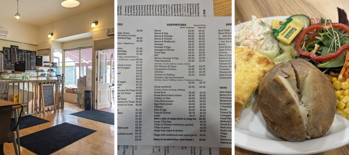 Charlie’s is an inviting cafe with a warm and friendly atmosphere. The decor is simple and uncluttered, with lots of natural light streaming in through the windows for the front tables. The further back you go, there is no windows so it’s not as bright. It can be a squash and squeeze getting between some of the tables.There are plenty of comfortable seating options, both indoors and outdoors. Food: Charlies cafe offers a wide variety of traditional English dishes, coffee drinks, as well as tea and a popular ice cream selection. I tried their standard English breakfast , which was delicious and perfectly made. Service: The service at Charlie’s Cafe is excellent. The staff is friendly and attentive, and they always make you feel welcome. Overall: Charlie’s Cafe is a great place to go for a cup of coffee, breakfast or lunch. The atmosphere is warm and inviting, the food is delicious, and the service is excellent. I would definitely recommend it to anyone looking for a great cafe experience. Here are some additional details about my experience at Charlie’s Cafe: I visited Charlies Cafe on a Sunday afternoon. It was a bit crowded, but the wait was not too long. I ordered an English breakfast which was delicious. Bacon, sausage, egg, beans, tomatoes and mega thick bread. Had to pay extra for crunchy hash browns. There was plenty of food and I failed to eat the whole meal. The service was excellent. The staff were friendly and attentive. Overall, I had a great experience at Charlies Cafe. I would definitely recommend it to anyone looking for a great cafe experience.